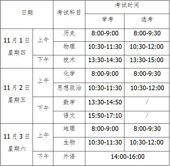 选考考试科目:思想政治、历史、地理、物理、化学、生物、技术(含信息技术、通用技术)。