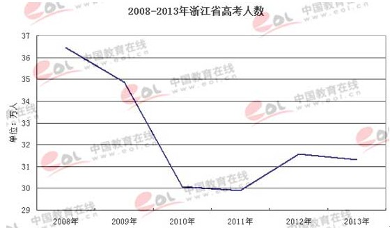 2013年浙江普通高考考生31.3万人,比去年减少2700人,减幅为0.9%。受到适龄人口下降等问题的影响。近几年,浙江高人数下降明显。较2008年36.44万人报名,五年间,减少了5万多人。