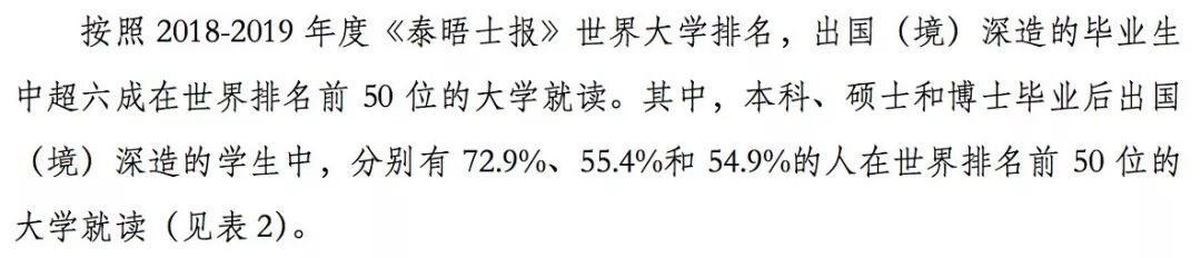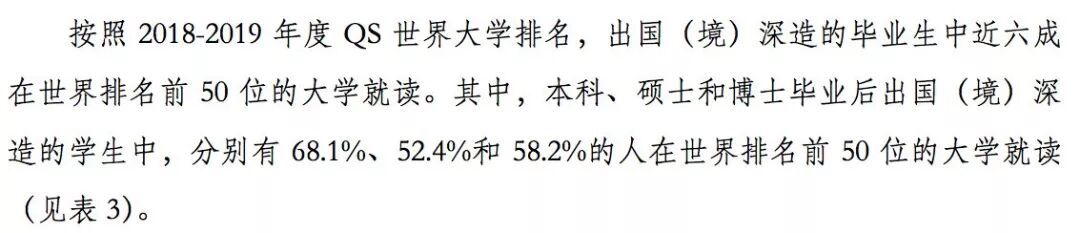 根据2018-2019年《泰晤士报》世界大学排名,我校2018届毕业生中共有668人赴世界排名前50名的国(境)外高校留学深造,占出国(境)总人数的58.19%。其中出国(境)的本科毕业生有65.61%在排名前50名的高校就读。