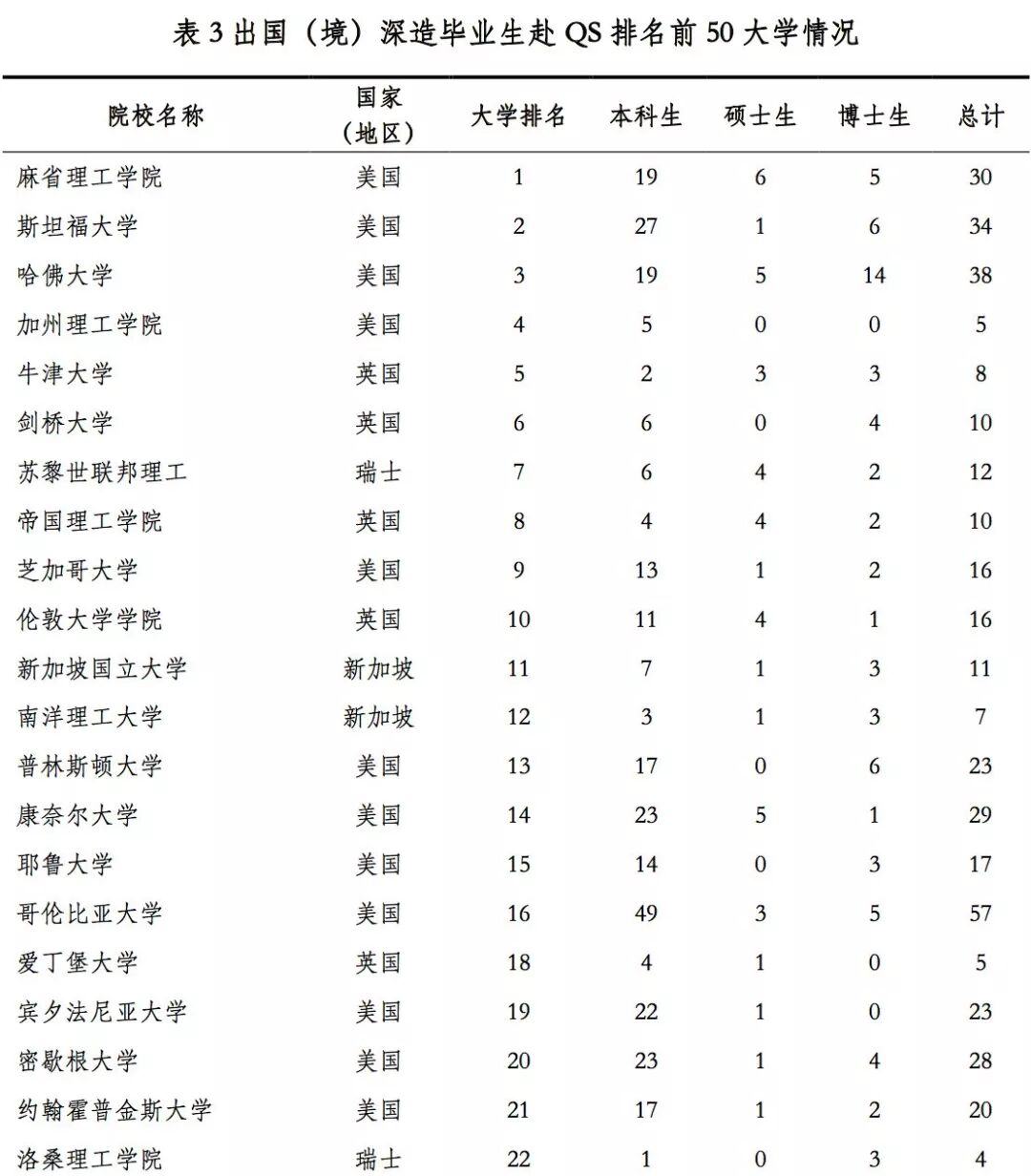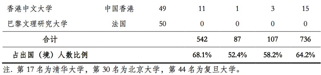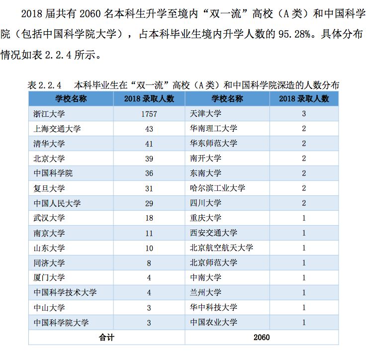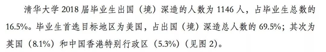 从本科生的情况来看,清华大学2018届本科生出国(境)深造人数619人,出国(境)深造率为26.3%,相比2017届毕业生的28.2%下降1.9个百分点;北京大学2018届毕业生出国(境)留学817人,占比30.34%,相比2017届毕业生的30.85%下降0.5%。 浙江大学2018 届共有 1320 名本科毕业生出国(境)深造,占本科毕业生总数的 22.86%, 较去年下降了 1.3%。 上海交通大学2018届本科生出国(境)深造人数924 人,出国(境)深造率为26.32% ,相比2017届本科生的28.06%同样下降1.7%。南京大学、西安交通大学和哈尔滨工业大学出国(境)深造情况也类似。