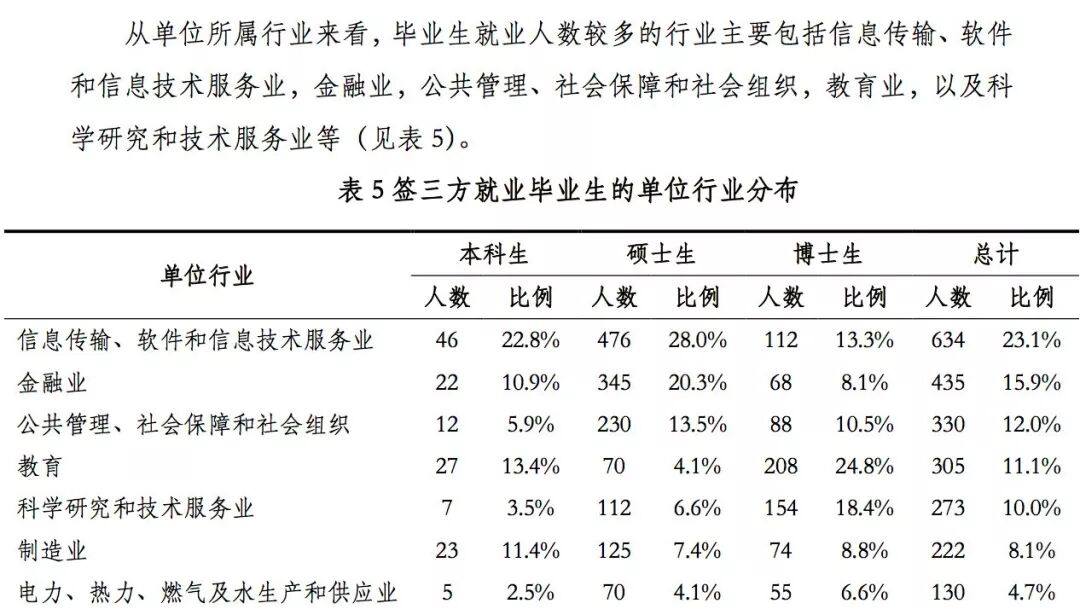 从7所C9高校实际就业单位所属行业来看,毕业生人数较多的行业主要包括信息传输、软件和信息技术服务业,金融业,科学研究和技术服务业等。