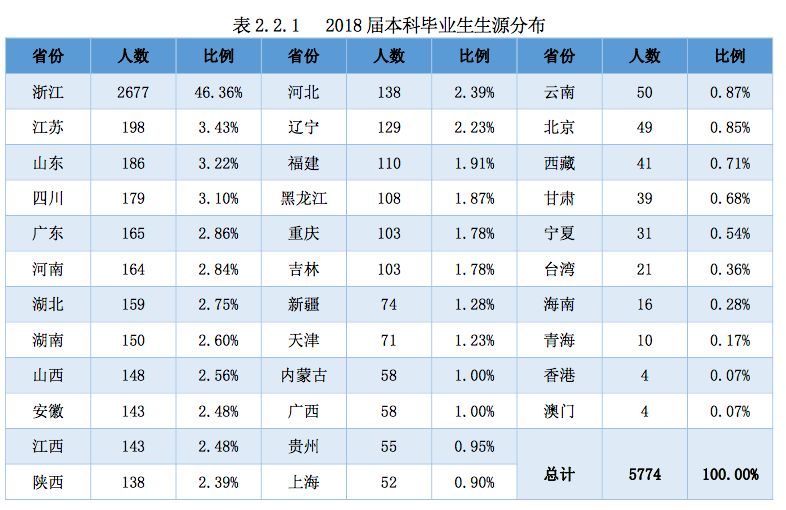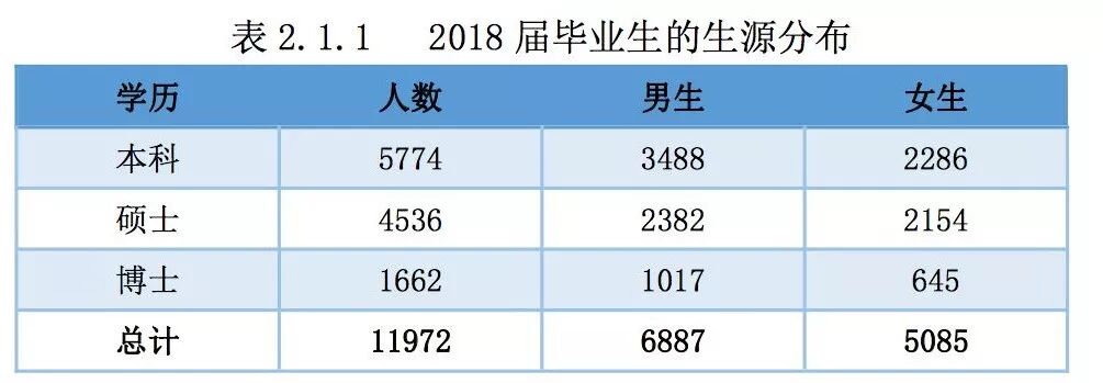 浙江大学 2018 届毕业生共有 11972 人。其中,本科生 5774 人、硕士生 4536人、博士生 1662 人;男生 6887 人、占 57.53%,女生 5085 人、占 42.47%。