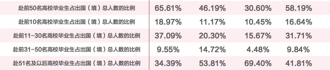 对于顶尖高校来说,相当一部分毕业生毕业后会选择出国(境)深造继续学习,其中本科生是出国(境)深造的主力军。不过从近几年统计数据来看,顶尖高校毕业生的出国(境)深造率呈下降趋势。