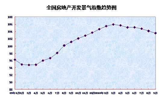 9月份,全国房地产开发景气指数(简称“国房景气指数”)为103.52,比8月份回落0.59点,比去年同期提高2.44点。