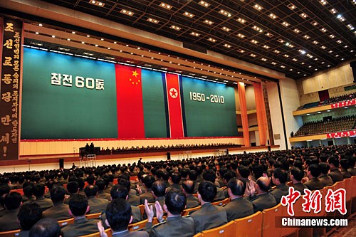 中新社平壤10月25日电 (记者 孙自法)朝鲜25日下午在平壤体育馆举行约3万人参加的盛大集会,隆重纪念中国人民志愿军入朝参战60周年.朝鲜劳动党总书记金正日,最高人民会议常任委员会委员长金永南,内阁总理崔永林,党中央军事委员会副委员长李英浩,党中央军事委员会副委员长金正恩,国防委员会副委员长金永春、李用茂、张成泽等朝鲜党政军领导人参加集会。