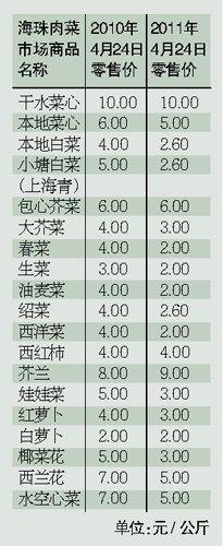 记者从广州市价格信息网了解到的情况证实了商家的说法,以海珠肉菜市场为例,记者随机统计了19种常见蔬菜昨日的价格,与2010年同期的价格相比,只有芥兰9元/斤的价格比去年同期要贵;干水菜心、包心芥菜、西红柿的价格则与去年同期持平。而剩下的15种蔬菜价格均比去年要大幅度下降,像春菜、油麦菜、西洋菜等价格,今年的价格缩水了约50%。