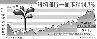 到5月6日收盘时,纽约商品交易所6月交货的轻质原油期货价格下跌2.62美元,收于每桶97.18美元。伦敦市场6月交货的北海布伦特原油期货价格下跌1.67美元,收于每桶109.13美元。