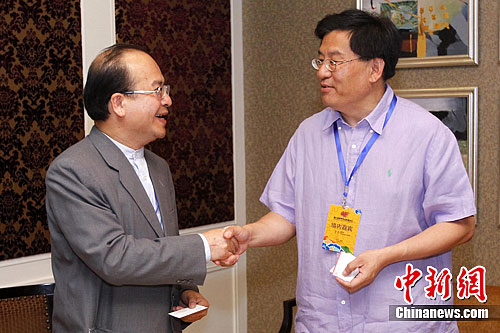 第六届世界华文传媒论坛将于2011年9月17日在重庆开幕。9月16日,世界华文传媒领军人物纷纷抵达重庆,在大会主办方接待处报到。图为中国新闻社总编辑章新新(右)欢迎抵达重庆参会的台湾中央社董事长陈国祥。中新社发 富田 摄