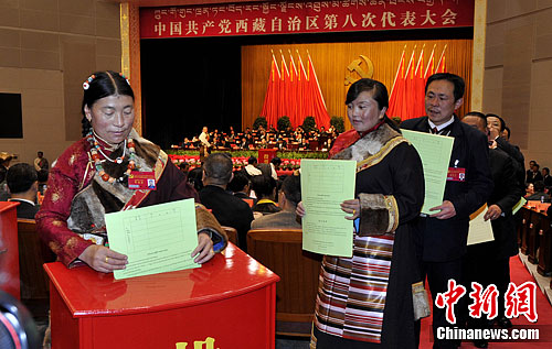 资料图:10月以来,中共省级党委换届陆续进行,截至目前已有13省区选出新一届领导班子。图为在中共西藏自治区第八次代表大会上身着民族服装的代表进行投票选举。中新社发 李林 摄