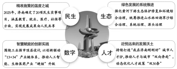 19.(19分)(1)(10分)①坚持以人民为中心的发展思想(或“新时代必须完整、准确、全面贯彻新发展理念”),(1分)实现发展为了人民、发展依靠人民、发展成果由人民共享。(任意一分句即可得1分)②坚持创新发展理念,(1分)推动产业结构优化升级“或“建设现代化产业体系”,或“建设创新引领、协同发展的产业体系”,或“科技创新推动完善产业链”等)。(1分)③坚持协调发展理念,(1分)促进经济社会协调发展。(1分)④坚持绿色发展理念,(1分)推进人与自然和谐共生(或“保护自然和生态环境”等)。(1分)⑤坚持共享发展理念,(1分)增强泉城市民的获得感、幸福感、安全感(或“提高泉城人民生活水平”等)。(1分)⑥重视人才在发展中的基础性、战略性支撑作用(或“人才是第一资源”),(1分)推动人才与城市“双向奔赴”。(1分)